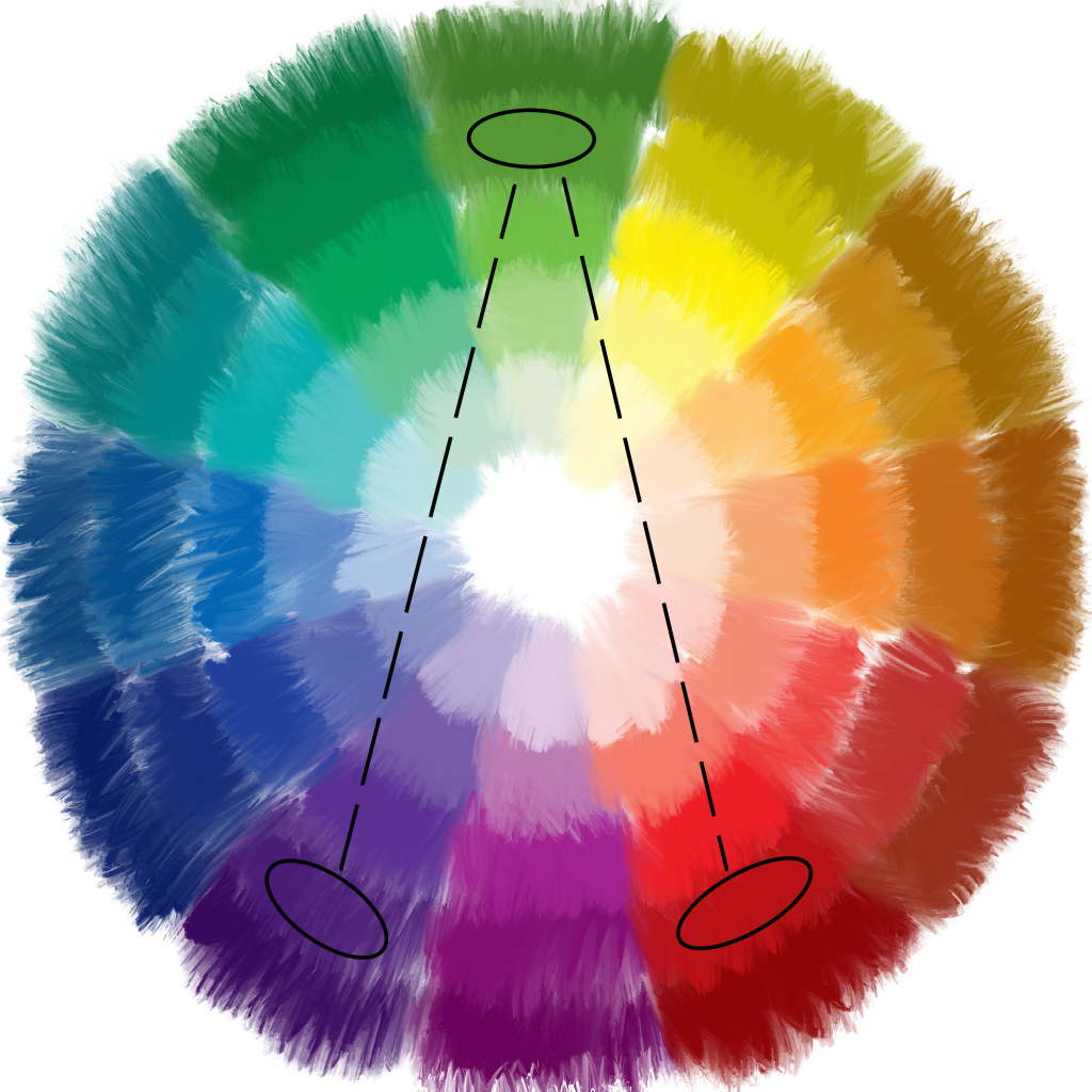 Wariacją schematu komplementarnego (po ang. split complementary) jest wybór koloru wiodącego i dwóch kolorów akcentowych znajdujących się po obu stronach jego koloru dopełniającego: