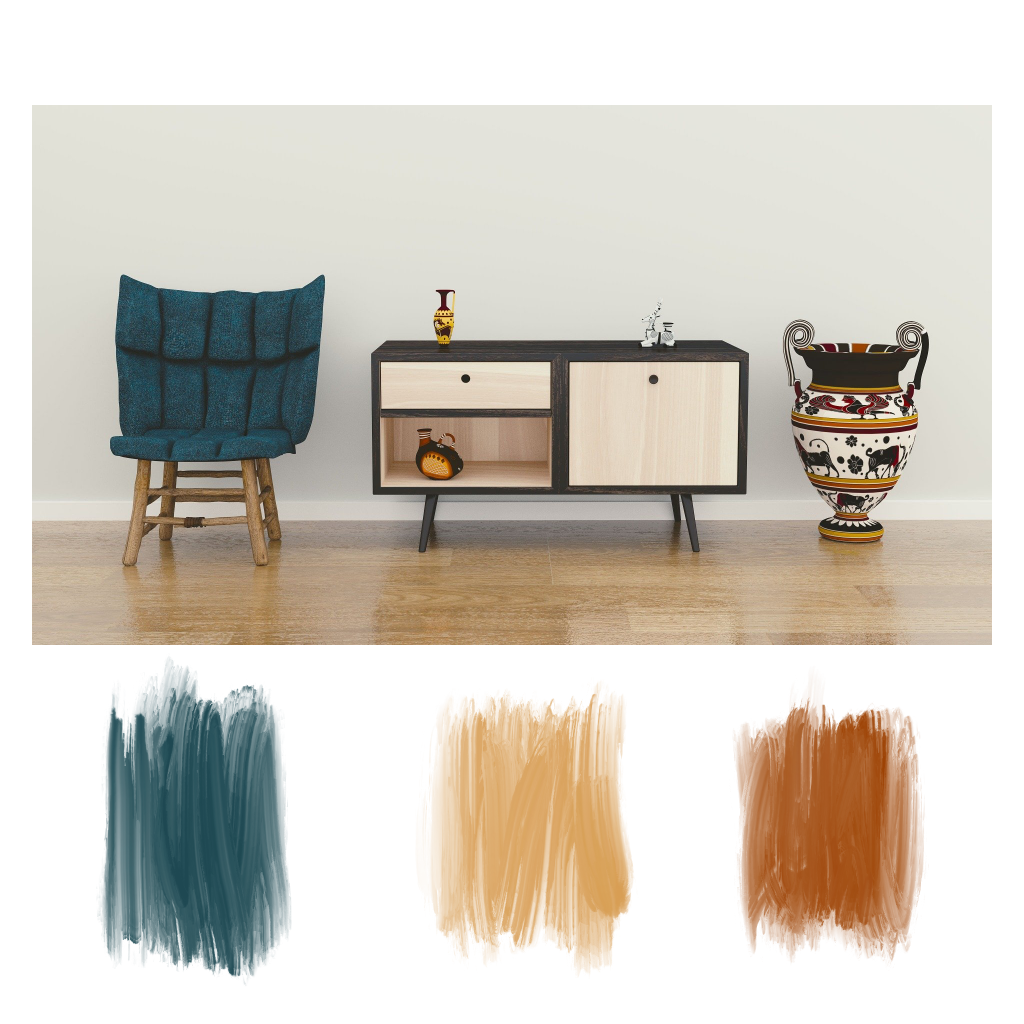 No dobra, oglądanie kolorów tęczy oglądaniem tęczy, ale jak na konkretnym przykładzie zobaczyć dobrze dobrany schemat kolorystyczny? Weźmy przykład triady, czyli mogłoby się zdawać najbardziej nieintuicyjnego i pstrokatego zestawu kolorów i zobaczmy, czy można z nich ułożyć harmonijną kompozycję wystroju wnętrza.